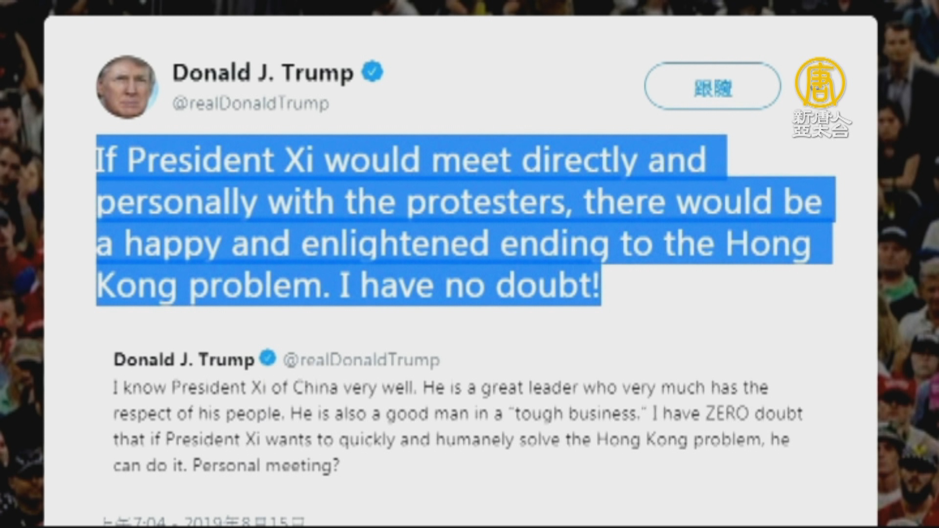 【新唐人亞太台 2019 年 08 月 16 日訊】早安新唐人,先來關心,港人長達兩個多月的抗爭,要求香港政府撤回送中逃犯條例,對此,美國總統川普週四再次發表推文,建議習近平親自和香港抗議者會面,解決香港問題。川普推文寫到,「如果習主席能夠與(香港)抗議者直接和親自會面,那麼香港問題就會有一個美好和開明的結局。我毫不懷疑!」目前,美國國會正討論三項有關香港問題的法案。將決定香港是否能獲得現在所享有的特殊的經濟和貿易優惠,另外,也研擬,對破壞香港自由的人的進行制裁。