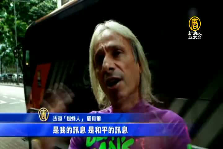 素有「蜘蛛人」之稱、57歲的法國人羅貝爾,週五早上爬上位於香港中環的長江集團大樓,懸掛一面旗幟。