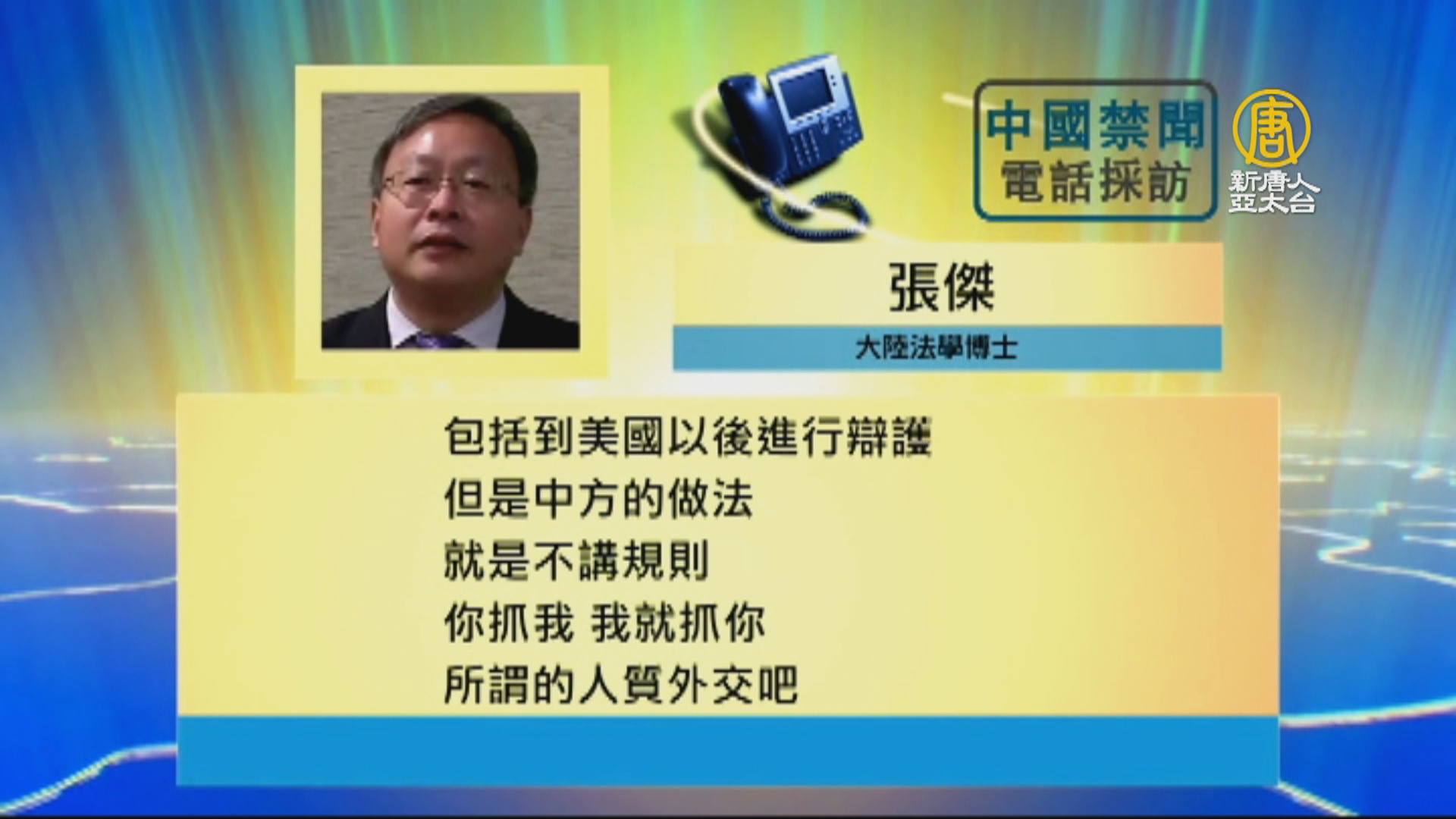大陸法學博士 張傑:「加拿大抓人是根據跟美國的司法條約來的,它是一種法治行為,你可以通過法律方式去救濟,包括聽證,包括到美國以後進行辯護。但是中方的做法就是不講規則,你抓我,我就抓你,所謂的人質外交吧!這麼一種做法就像一個巨大的怪獸突然闖進了文明社會。」