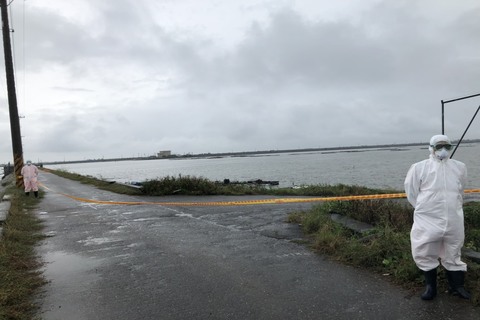 海巡人員至壽島海堤,發現豬隻屍體外觀已有浮腫狀況,人員立即依防檢疫標準作業程序,穿著防護衣保護協處人員之安全,並拉起封鎖線管制現場人員之進出,通報嘉義縣家畜疾病防治所派員至現場協處。