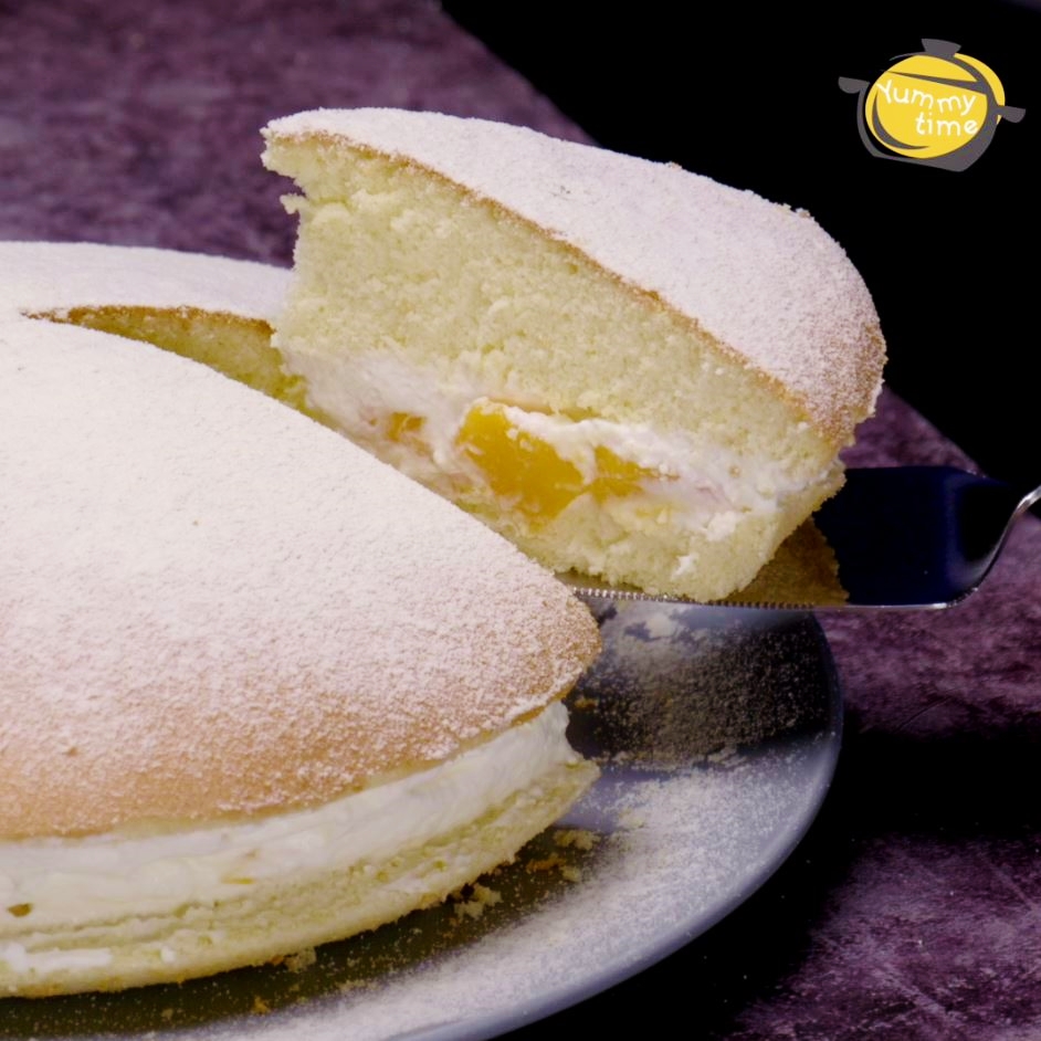 9. 蛋糕脫膜後,從下緣將蛋糕切對半,在下片蛋糕抹上中間厚、邊緣薄的鮮奶油,並放上切好的芒果塊,最後蓋上上片蛋糕片,灑上奶粉(糖粉),完成!
