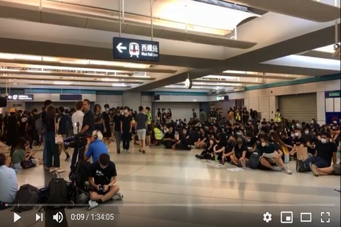 有將近千名黑衣人在元朗西鐵站大堂及地下空地聚集,參與靜坐的黑衣市民全體站立,為反對修訂「逃犯條例」風波以來受傷的示威者默哀。部分民眾用手掩着右眼,為香港一名女示威者11日於尖沙嘴疑似被布袋彈打中,右眼破損可能失明表達哀悼。