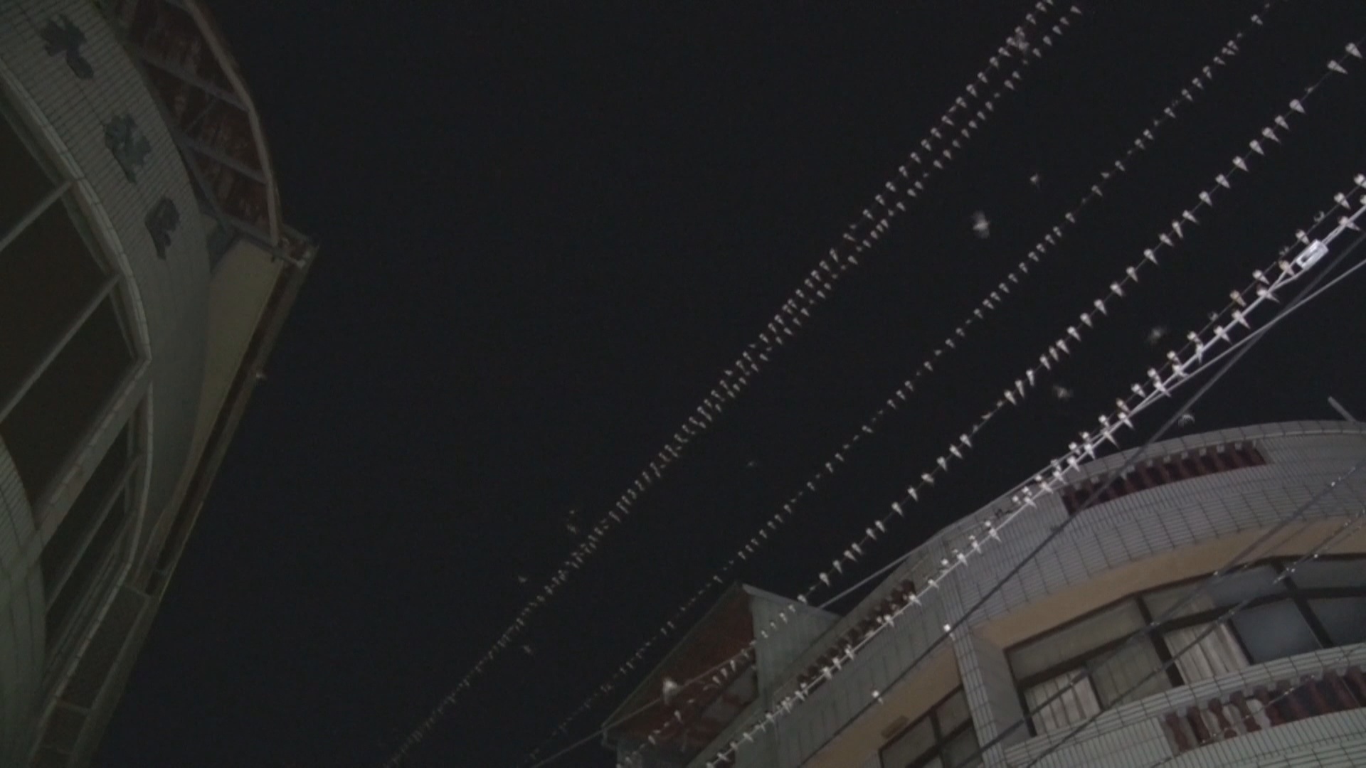 暗夜的天空中,電線桿電線上,站滿密密麻麻的燕子,有些飛來飛去,或停在電線上排排站,讓附近民眾嘖嘖稱奇。