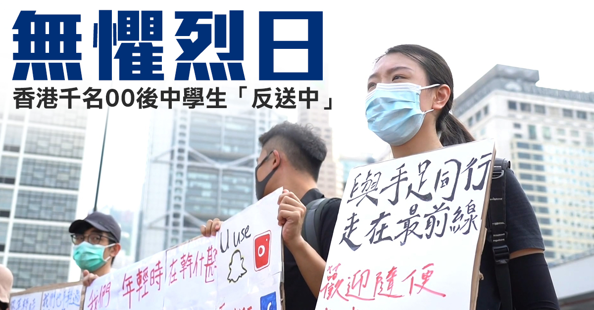 記者:「現在的溫度是攝氏32度,體感溫度38度。在這樣的烈日當空下,很多中學生來到這裡進行集會,而當中很多都是00後。」