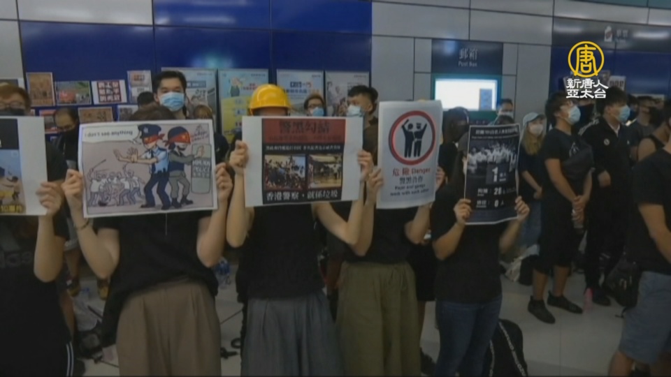 高喊口號,手拿標語,抗議警黑合作,上個月21日,元朗港鐵站發生,白衣人暴打市民事件,有民眾報警求助,指控警方遲遲不派人處理,泛民主派譴責「警黑勾結」,事隔一個月,香港示威者發起靜坐活動,有上千名示威者聚集。