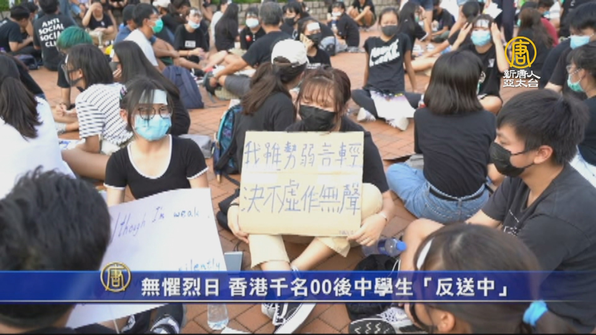 記者:「現在的溫度是攝氏32度,體感溫度38度。在這樣的烈日當空下,很多中學生來到這裡進行集會,而當中很多都是00後。」