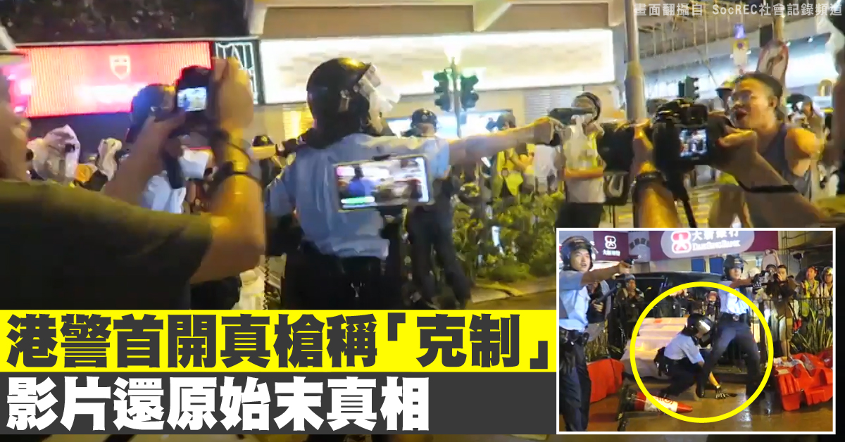 香港警察公共關係科高級警司 余鎧均:「(跌槍與他向記者舉槍,是另外一個很危險的,知不知道?開槍的時候是否有口頭警告? )我們做了口頭警告了,但是當然大家看到方才的情況是相當的危急,我們同事的生命亦也受到嚴重的威脅,所以我們向天開了一槍,但這一槍並沒有打中任何人。」