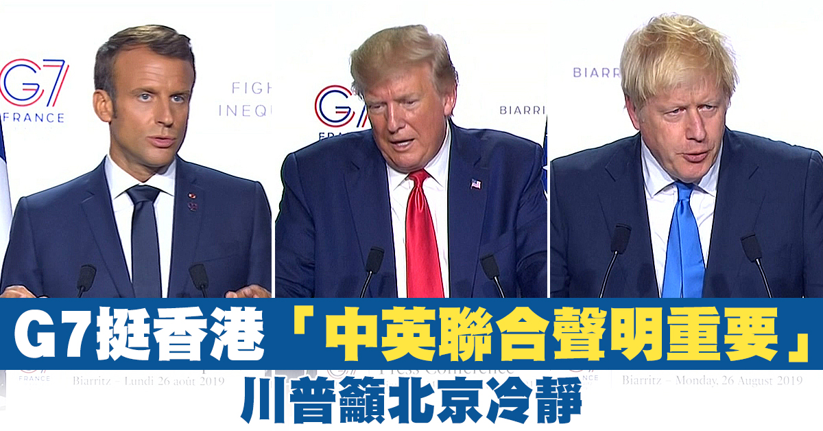 G7七國集團峰會周一(26日)在法國落幕,七國領導人發表聯合聲明,重申《中英聯合聲明》的存在與重要性,以及規定的香港自治權,呼籲避免暴力、各方保持冷靜。