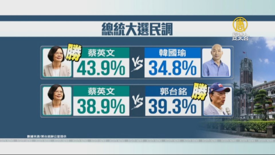 【新唐人亞太台 2019 年 08 月 27 日訊】歡迎回來,隨著2020大選越來越近,郭台銘陣營今天(27日)公布內部民調,其中總統蔡英文在「三角督」或「四角督」支持度都是最高,唯一能勝過蔡英文的局面,是由郭台銘對上蔡英文,將會險勝。而韓國瑜在總統初選過關時的民調為47%,但郭辦公布的民調顯示,一個多月來,韓國瑜的支持度已經崩跌了20%。