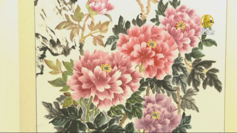 美麗紅白相間的花朵在屋前的池塘邊綻放,鳥兒在紅色的梅花枝頭啼叫、朱紅荷花水中亭亭玉立,也有牡丹花開豔麗,讓人賞心悅目,更有不知名的黃花,自己從夾縫中綻放出來,展現堅韌的生命力,畫家以敏銳觀察勾勒出繽紛的花朵。