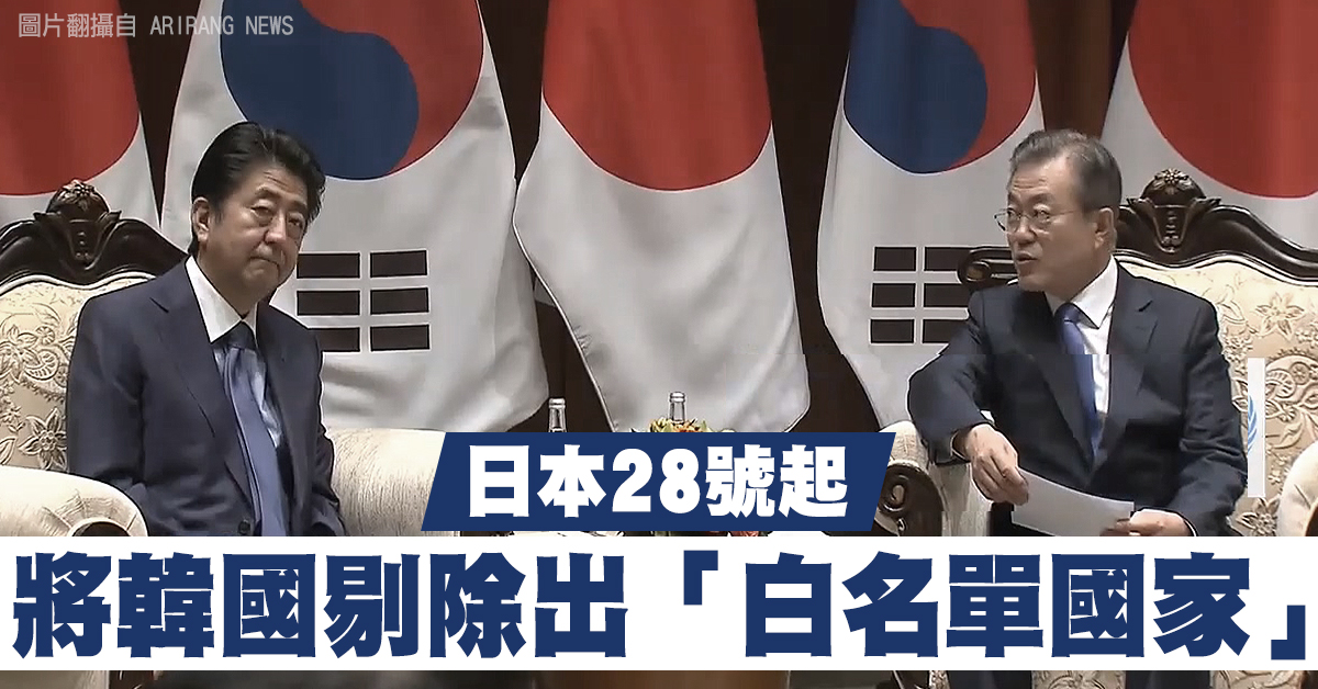 阿里郎新聞主播:「日本將南韓移出日本的「出口白名單」,從今天開始成為現實,為首爾和東京的關係投下更黑暗的陰影。不過,在接下來幾週、幾個月為兩國領導人安排的一系列國際活動,觀察人士表示,至少有一絲希望,雙方可以達成某種妥協,以化解他們的貿易爭端。」