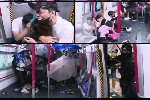 片中1分16秒處,蒙面武裝港警使用40MM大口徑槍械,近距離指向車廂內的市民進行威嚇,之後更瘋狂棒打,甚至對高舉雙手的市民使用大劑量胡椒水發射器攻擊。