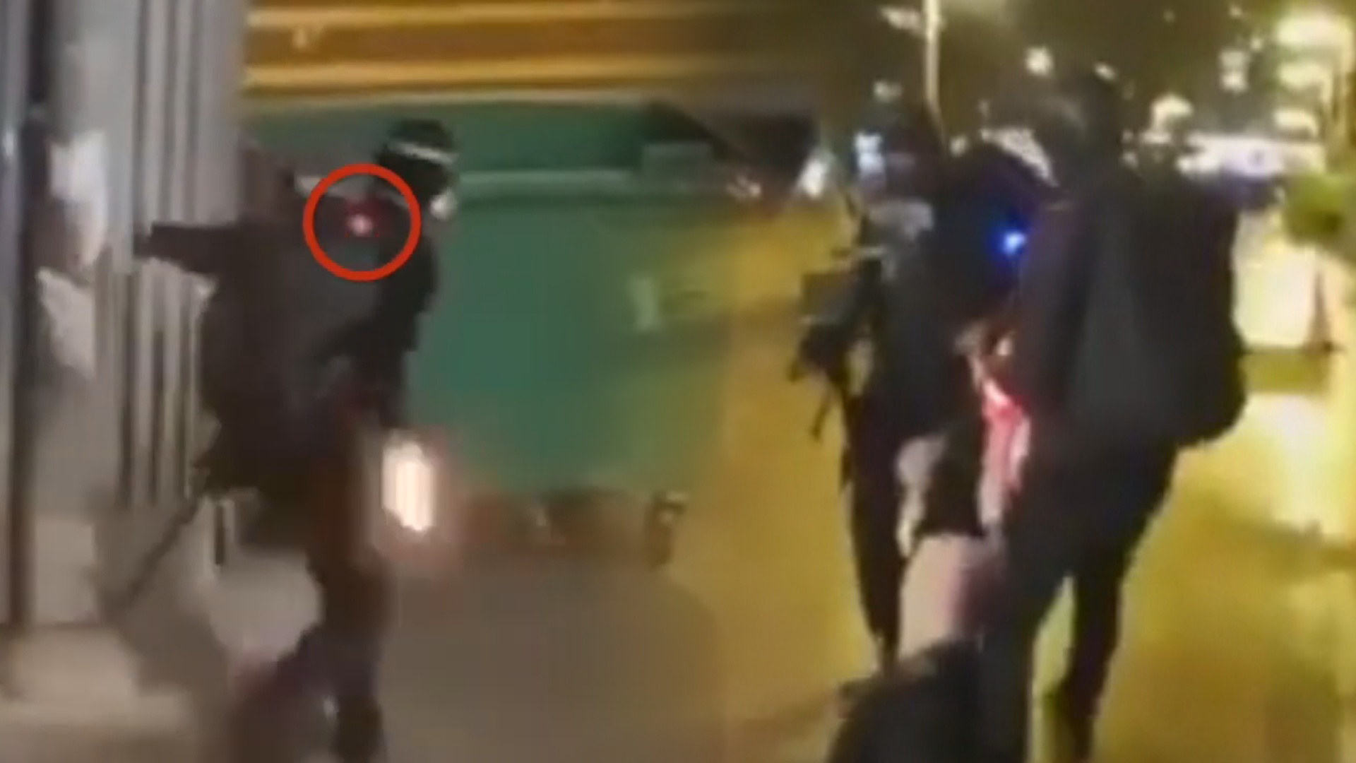朝著對街警察丟出汽油彈,仔細一看,這位黑衣人士背後配戴紅色的發光裝置。