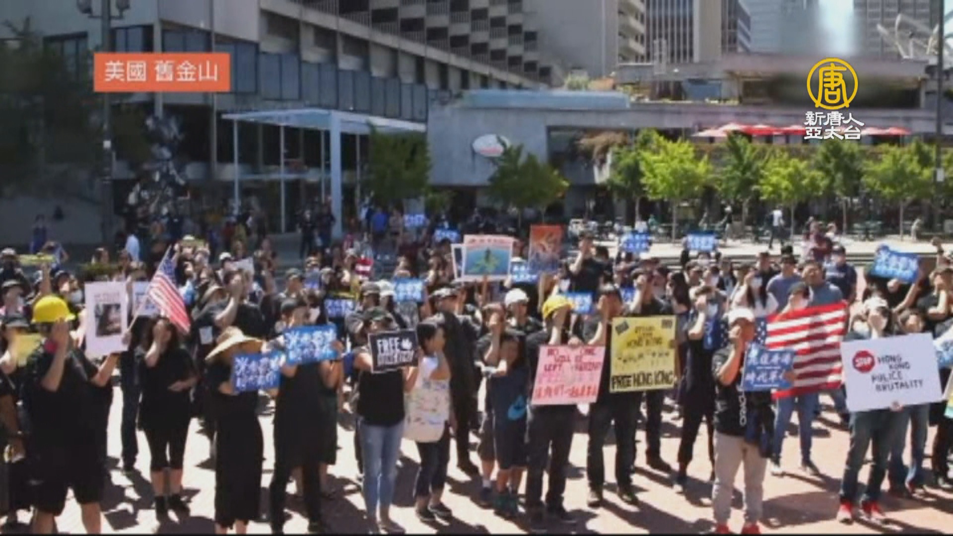 舊金山海濱廣場,上百名民眾手持「光復香港、時代革命」等反送中標語;單手摀眼,靜默站立,通過自發組織的快閃行動支持港人,強烈譴責警察暴力毆打示威者。