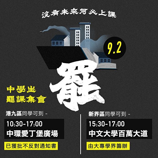 【新唐人亞太台 2019 年 09 月 02 日訊】繼8月31號,民陣集會和遊行申請被拒後,9月1日,港人又推出9·2罷課集會。罷課集會由香港大專學界籌辦,呼籲大專生以及港九區、新界區等中學生、大專生一同參與。目前「籌備平台」已經收到警方批出「不反對通知書」。新唐人電視今天也會從台北時間早上10點半開始,為您全程直播。