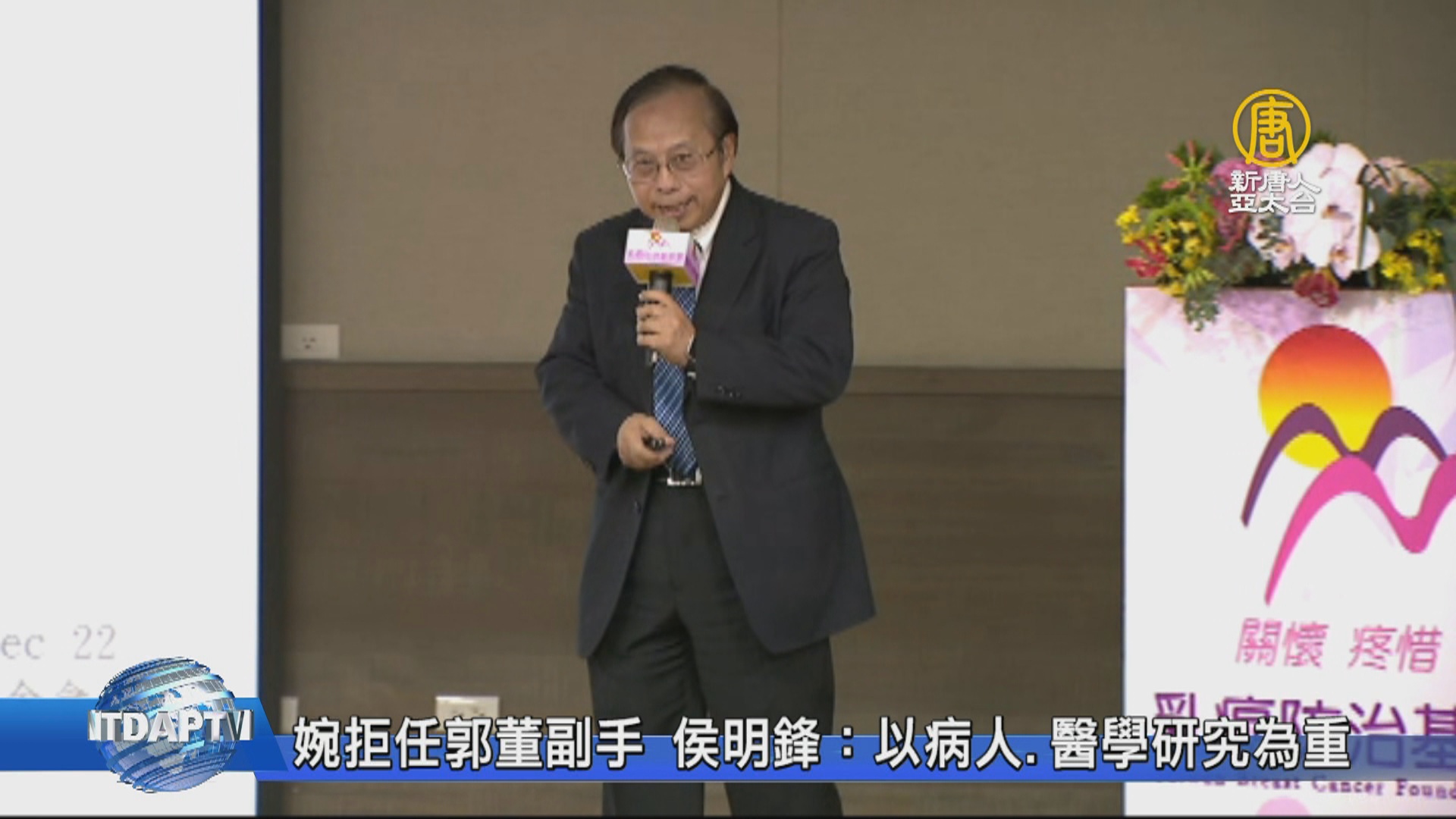 【新唐人亞太台 2019 年 09 月 02 日訊】鴻海集團創辦人郭台銘還沒正式宣布參選,副手人選就傳得沸沸揚揚,傳出有意找高醫院長侯明鋒擔任副手,郭台銘甚至直接表明,是適合人選。侯明鋒今(2)天回應,表示沒有和郭台銘聊過這件事,目前以病人及醫學研究為重,沒有想過參選從政這件事。