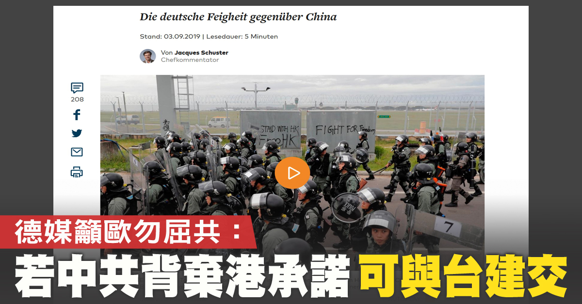 德媒籲歐勿屈共:若中共背棄港承諾 可與台建交