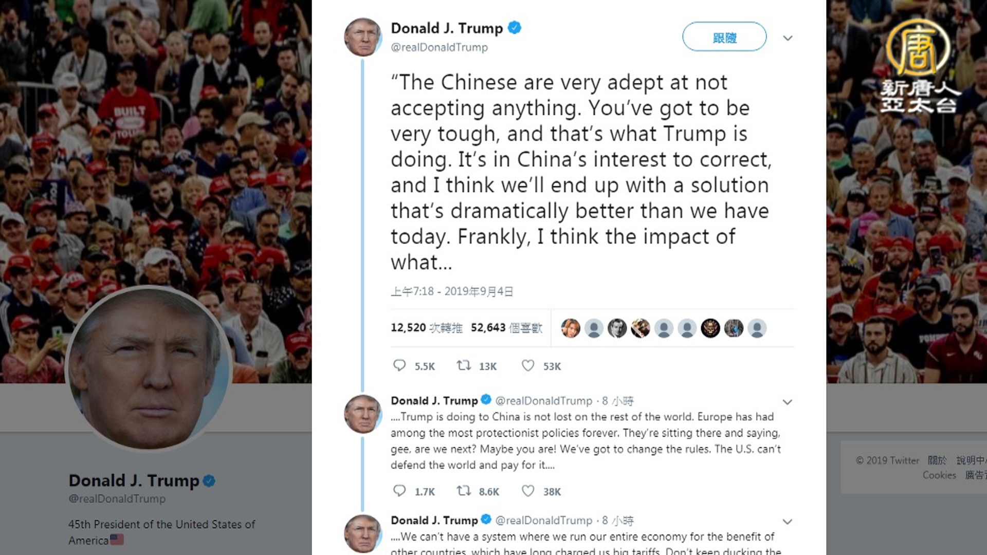 【新唐人亞太台 2019 年 09 月 05 日訊】在港人近3個月的「反送中」抗議後,中共支持的林鄭月娥政府週三(9月4日)終於做出讓步,宣布撤回引渡惡法。川普總統隨後在推特上再次肯定自己的做法說,對中共就是要強硬,這也正是他目前在貿易戰中的做法。糾正中共的不良做法實際上符合中國的利益。