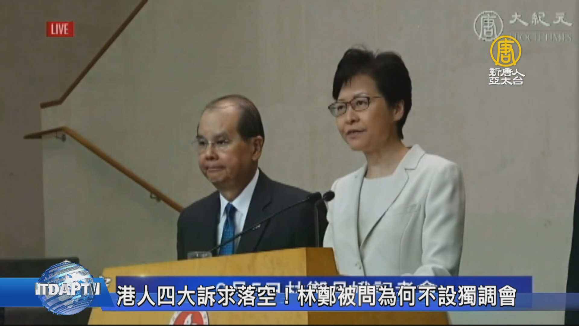 【新唐人亞太台 2019 年 09 月 05 日訊】港人近三個月的反送中抗爭,提出五大訴求,昨天港府終於宣布撤回送中逃犯條例,但其他四項訴求都落空,林鄭今天中午再開記者會回應,遭到記者質疑。