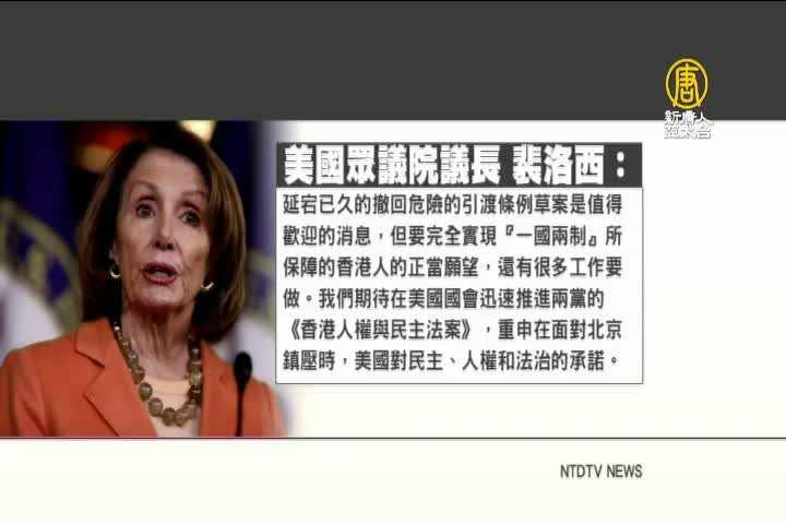 對於港府撤回修例的聲明,美國眾議院議長裴洛西(Nancy Pelosi)週三發出聲明,表示「延宕已久的撤回危險的引渡條例草案是值得歡迎的消息,但要完全實現『一國兩制』所保障的香港人的正當願望,還有很多工作要做。」「我們期待在美國國會迅速推進兩黨的《香港人權與民主法案》,重申在面對北京鎮壓時,美國對民主、人權和法治的承諾。」