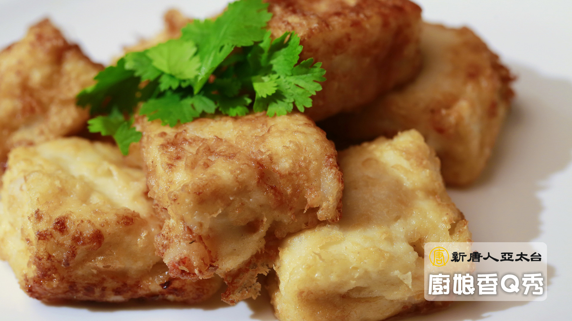 4. 模具裡先抺一層油,倒入麵糊。中大火蒸10分鐘倒模取出冷卻後,切成方塊狀。沾附麵粉大火油炸成金黃色,放入醬汁中即可食用