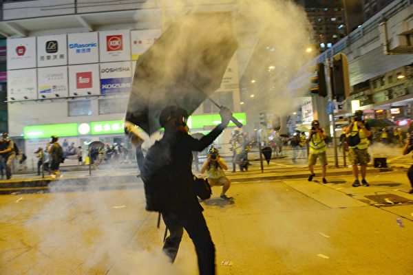 旺角警署警察連發催淚彈。隨後,持盾牌的防暴警察走上街。