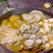 1. (備料)辣椒、薑切片,蔥切段,洋蔥切絲,馬鈴薯、櫛瓜切片,蛤蠣吐沙,豆腐切塊,金針菇洗淨,備用。