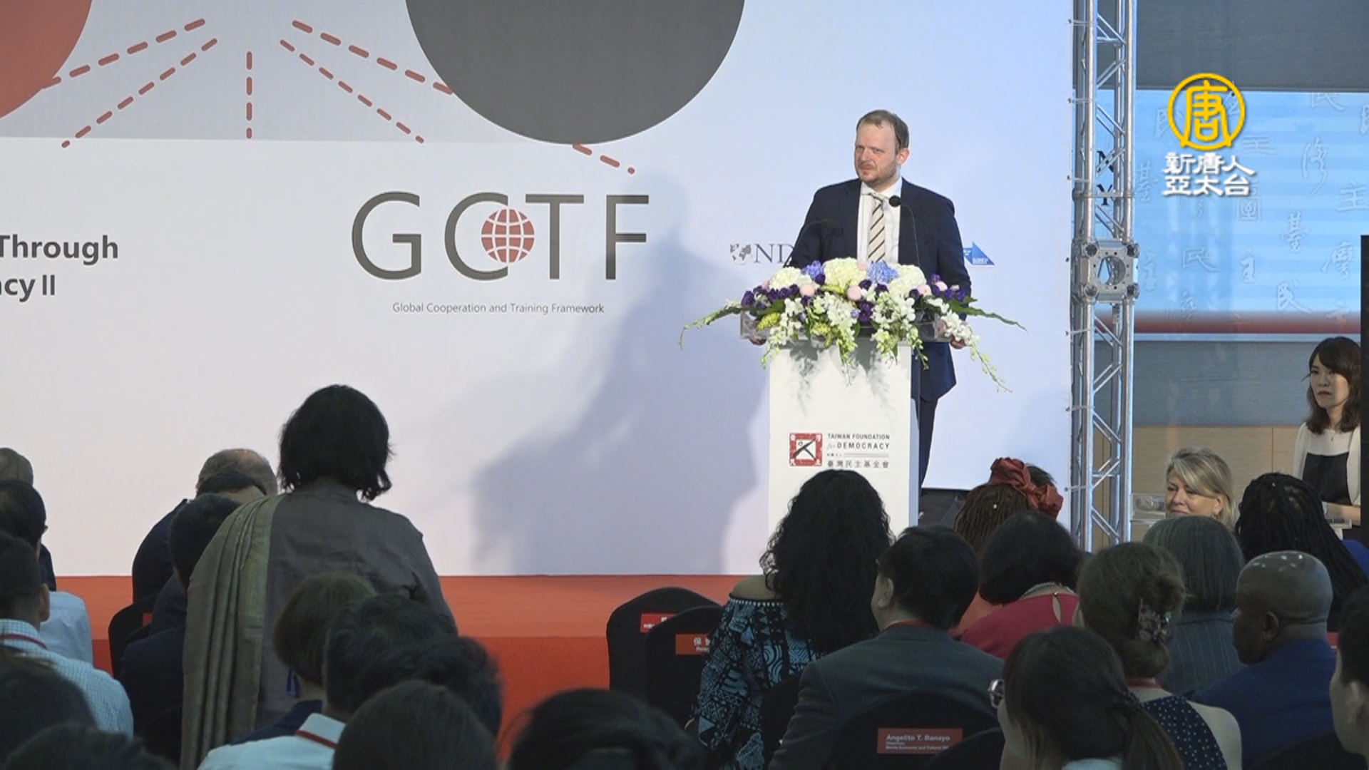 台美日瑞典四國合辦GCTF國際工作坊,大西洋理事會資訊戰專家卡連斯基(Jakub Kalensky)專題演講。(圖/新唐人陳進交攝)