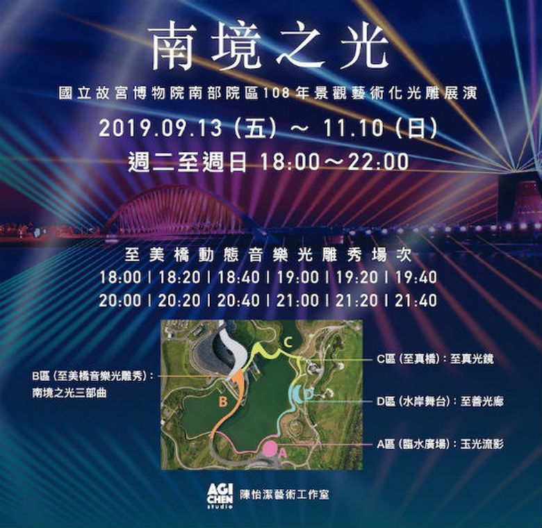 以博物館與至美橋為主視覺,透過新穎的雷射與燈光設計技術,將光衣披覆在環湖步道上,打造360度的環湖觀賞視角,讓音樂與燈光匯聚出的南院風情,這是繼浪漫水舞後,光雕藝術家陳怡潔、金曲爵士音樂家許郁瑛,再次聯手打造的絕美光雕秀「南境之光」,中秋夜將在故宮南院炫麗登場。
