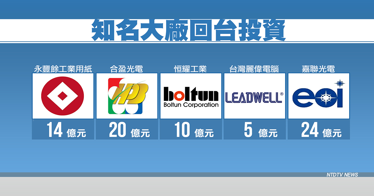 台商回台新增五家知名業者,台灣紙業龍頭永豐餘,宣布回台投資14億、全球第三大車用鏡頭廠合盈光電20億擴新廠房、特斯拉供應商之一的嘉聯光電,也以24億設研發製造中心。