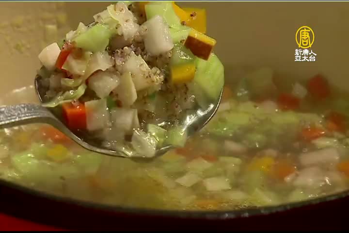 顏色鮮艷的五行蔬葉切丁炒香,加入清水燉煮,最後加入台灣自產的台東紅藜,鮮甜營養的「台灣紅藜火鍋」即刻上桌。