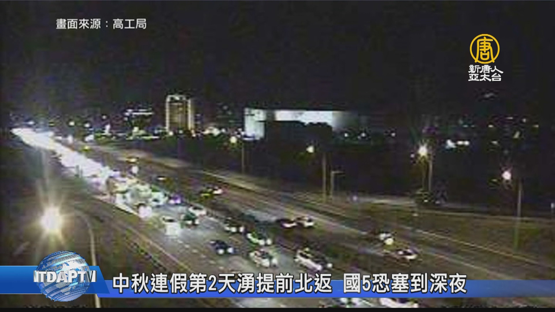 【新唐人亞太台 2019 年 09 月 14 日訊】頭條新聞先來關心,今天是中秋連假的第二天,今天港人在下午發起「天水圍親子遊」,再次爭取五大訴求,稍早香港防暴警察也出現,目前港人抗爭還在進行當中,今晚在我後方的螢幕,我們將為您持續追蹤動態。而關心一下台灣連假車潮,今天下午起提早出現北返車流,地雷路段包括國1北上西螺至埔鹽系統、南屯至后里、新竹系統至竹北;國3北上關西至大溪、大山到香山、竹山到中興;國5北上頭城至坪林。尤其國5號北上頭城至坪林路段,可能會塞到深夜12點,提醒用路人透過系統查詢避開車流或改走替代道路。