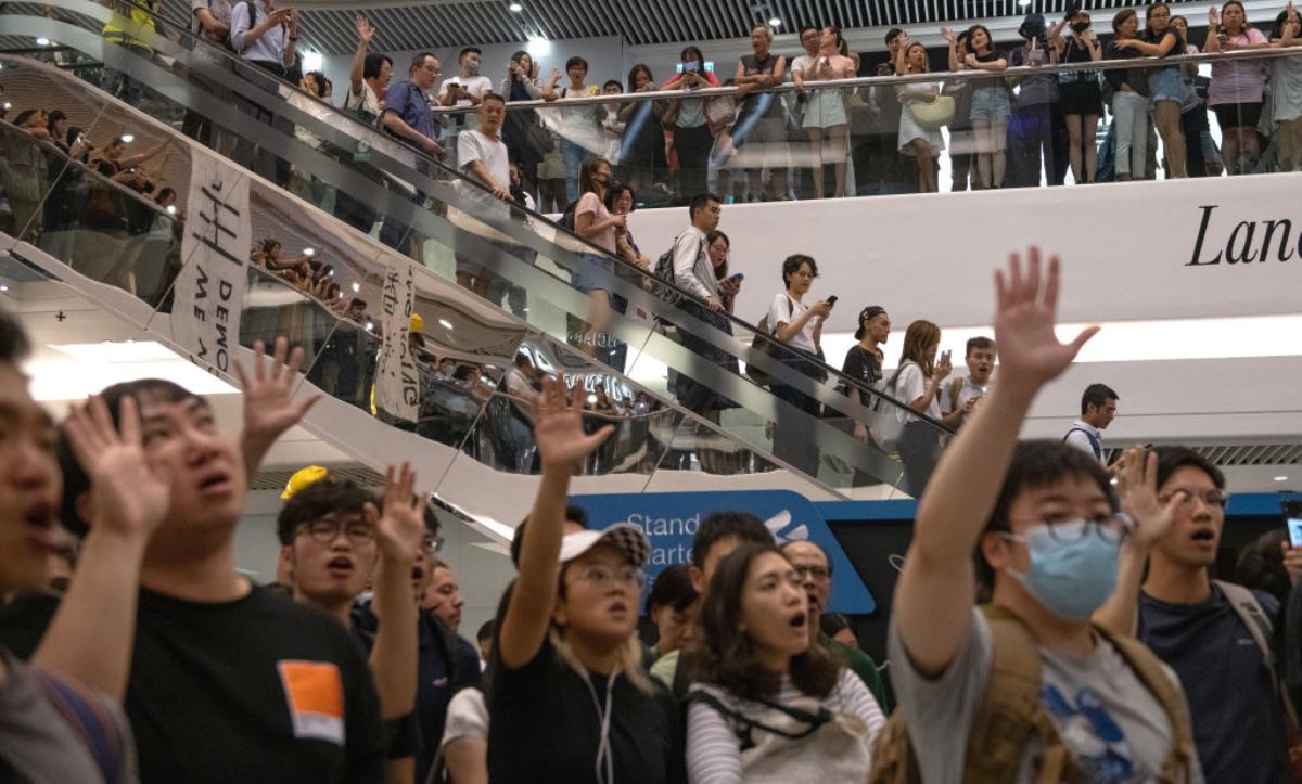 香港民眾2019年9月12日在時代廣場購物中心齊唱抗爭歌曲「Glory to Hong Kong」(《榮光歸於香港》),表達為爭取香港的民主自由抗爭到底的決心。(Carl Court/Getty Images)