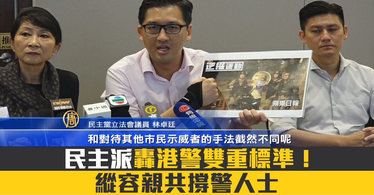 上個周末,一名穿著黑衣的男子與警方對話,呼籲港警冷靜,並且質疑警方為何拘捕他,但港警不聽解釋,直接帶走。而在北角疑似親共撐警人士,手拿菜刀威脅示威者,但遭警察逮捕時,卻不用戴手銬,民主派議員召開記者會,批評港警雙重標準。