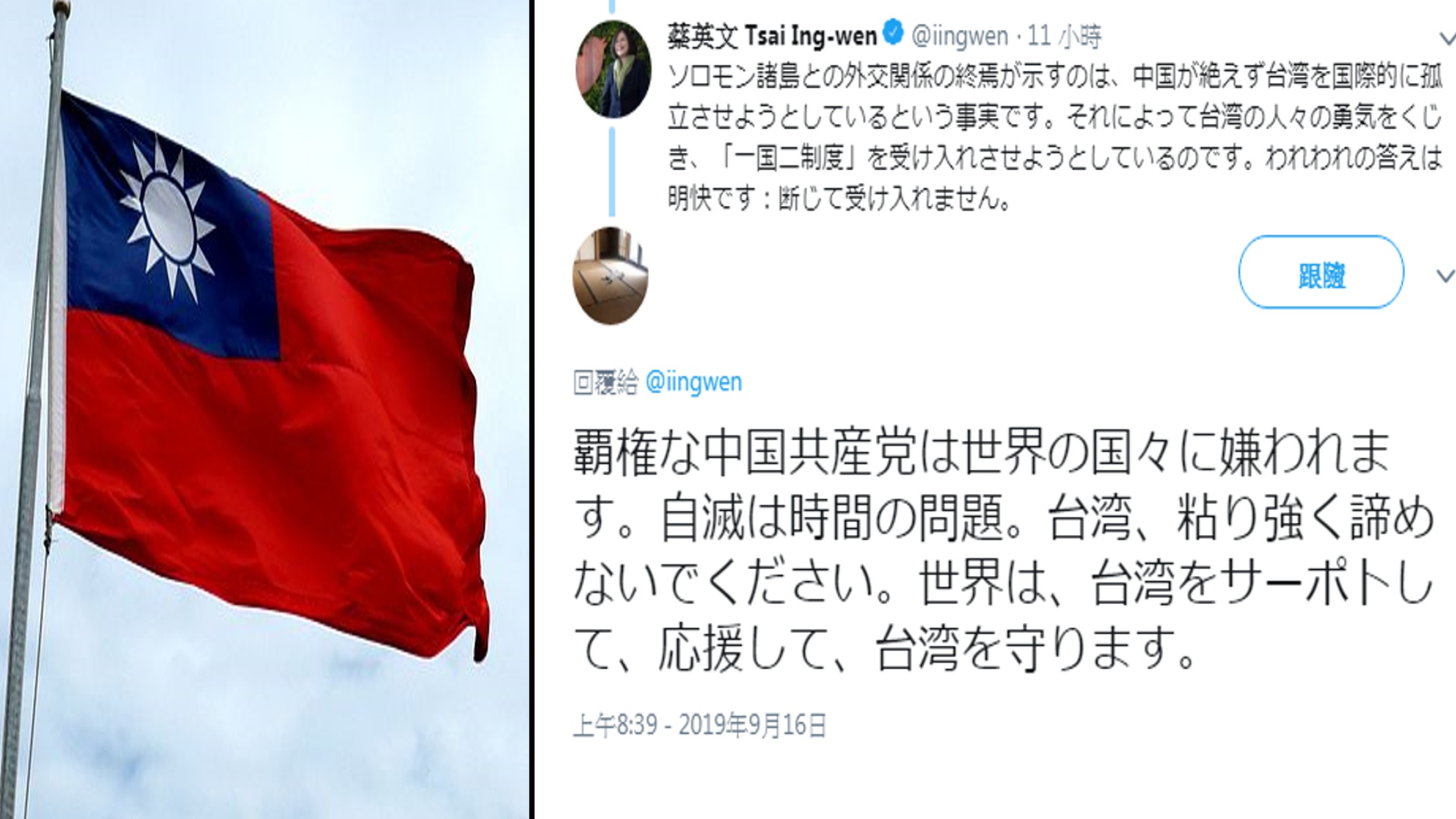 台索斷交 總統譴責中共破壞國際秩序 日網友挺台