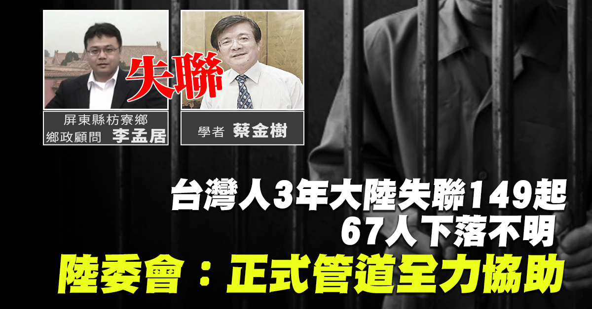 【新唐人亞太台 2019 年 09 月 19 日訊】歡迎回來,海基會昨天公布自2016年政黨輪替以來,受理149件台灣人在大陸失聯的陳情案,其中有67起至今沒有下落。陸委會副主委陳明祺今天(19日)表示,透過正式管道全力協助。