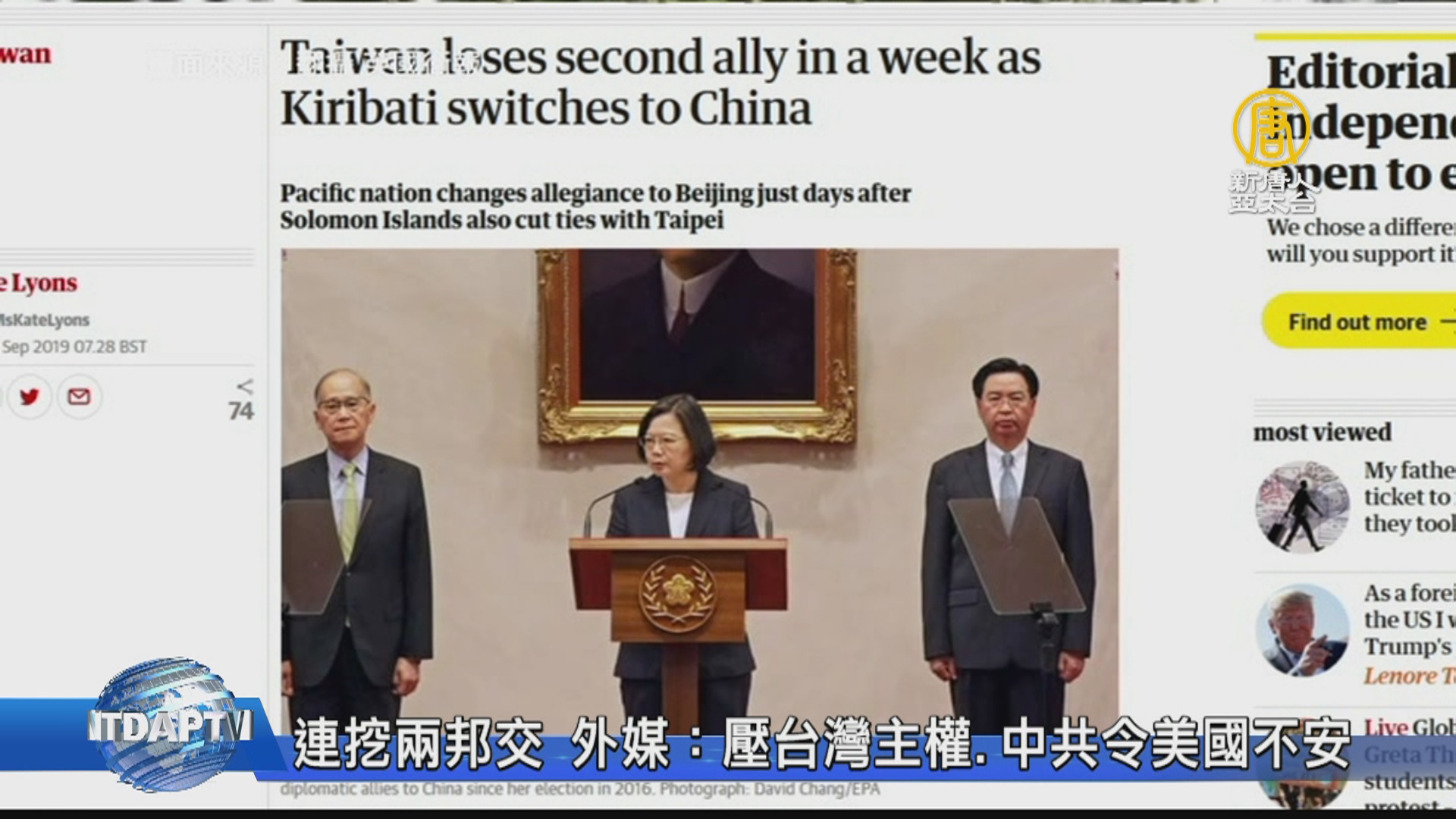 【新唐人亞太台 2019 年 09 月 20 日訊】中共連挖中華民國兩個南太平洋邦交國,多家外媒已關注報導。英國衛報報導,在明年大選前,中共企圖奪走台灣邦交,施壓強調台灣主權的蔡總統。路透社報導,外長吳釗燮說,中共企圖影響台灣大選、最終摧毀台灣主權。半島電視網則報導,中共在南太的最新外交策略,讓美國等西方盟友感到不安,華府正在重新評估對南太島國的援助,美國參議員盧比歐警告,必須反擊中共霸凌孤立台灣。