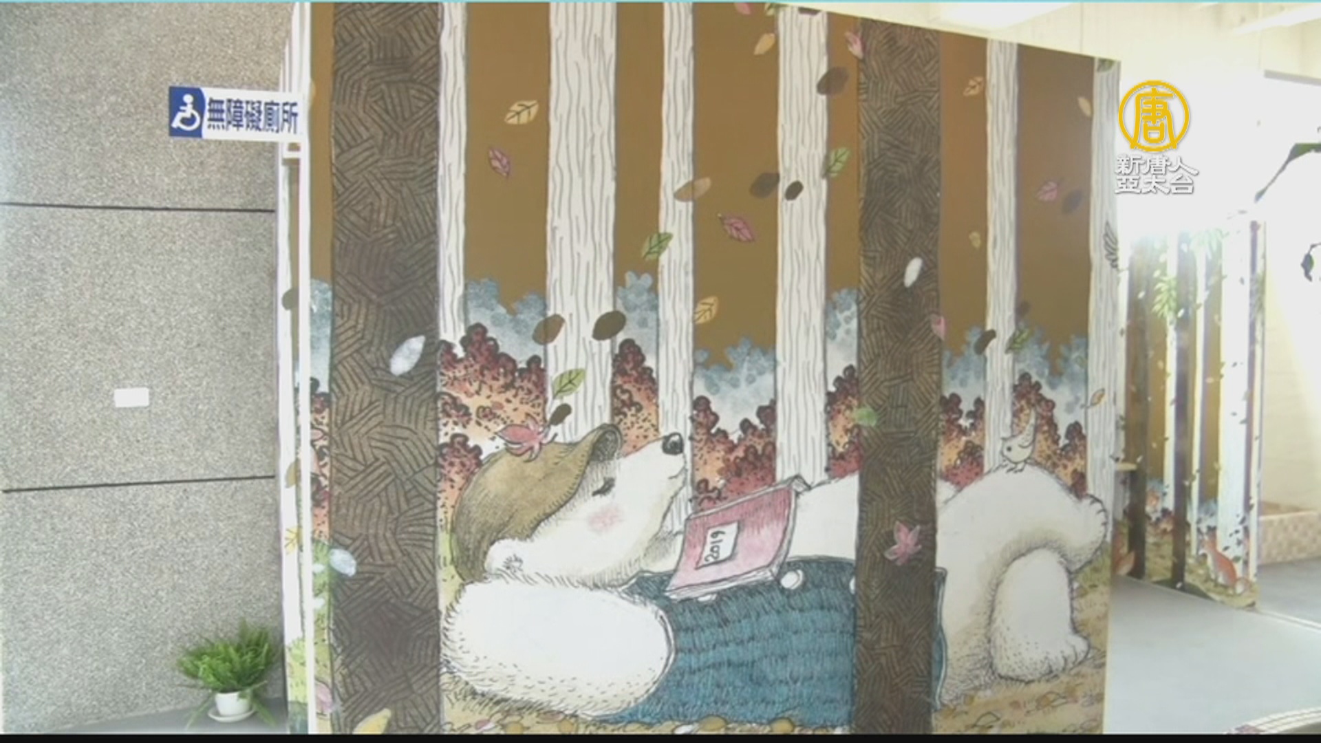 【新唐人亞太台 2019 年 09 月 20 日訊】嘉義市宣信國小因廁所老舊改建,邀請一位插畫藝術家校友、導入藝術元素,以大白熊為主角、四季為背景,改建成美麗又具繪本風格的藝術廁所。20日上午,一場簡短精彩的啟用典禮,讓大家看到不一樣的童話藝術廁所。