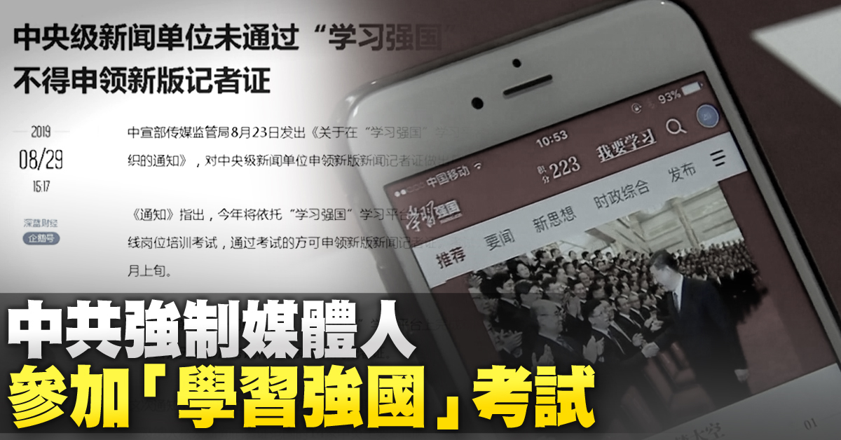 【新唐人亞太台 2019 年 09 月 24 日訊】中共中宣部8月23號通知,將通過「學習強國」手機應用程式,對全國新聞採編人員展開在線崗位培訓考試。有消息稱,北京大約一萬名記者和編輯將進行「試點測試」。大陸維權人士表示,中共強迫公職人員和媒體人使用「學習強國」是為了對他們洗腦和思想控制。