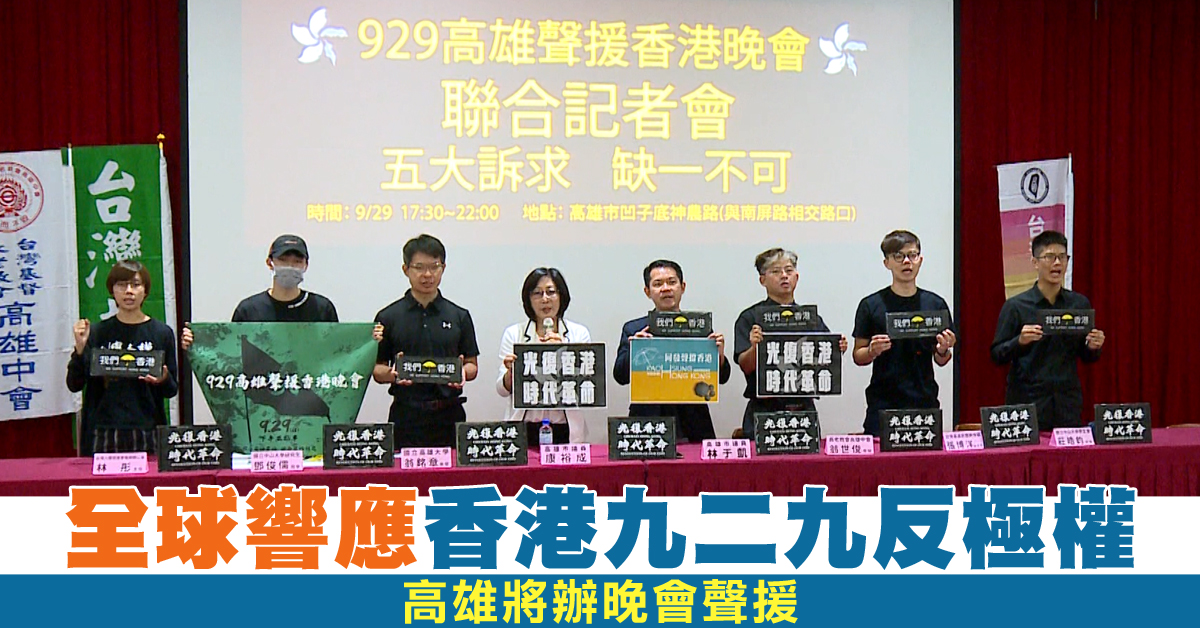 全球響應香港九二九反極權 高雄將辦晚會聲援