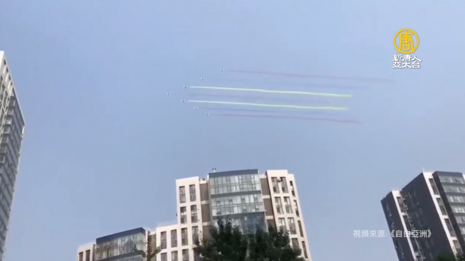 自由亞洲獲得北京的視頻顯示,北京長安街上空有多架中共軍隊最新型軍機排著隊,撒下彩色煙霧帶飛過。