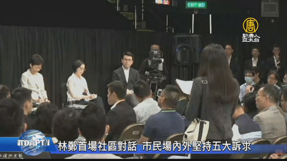 【新唐人亞太台 2019 年 09 月 26 日訊】歡迎回到新聞現場,帶您看到,香港特首林鄭月娥今天晚上(26日)舉辦第一場社區公開對話,大批重裝備警察到場進駐,港媒形容內外猶如戒嚴,大約130位市民入座。市民當著林鄭的面說,五大訴求,缺一不可,提出各種問題,但林鄭幾乎都沒有直接正面回答。