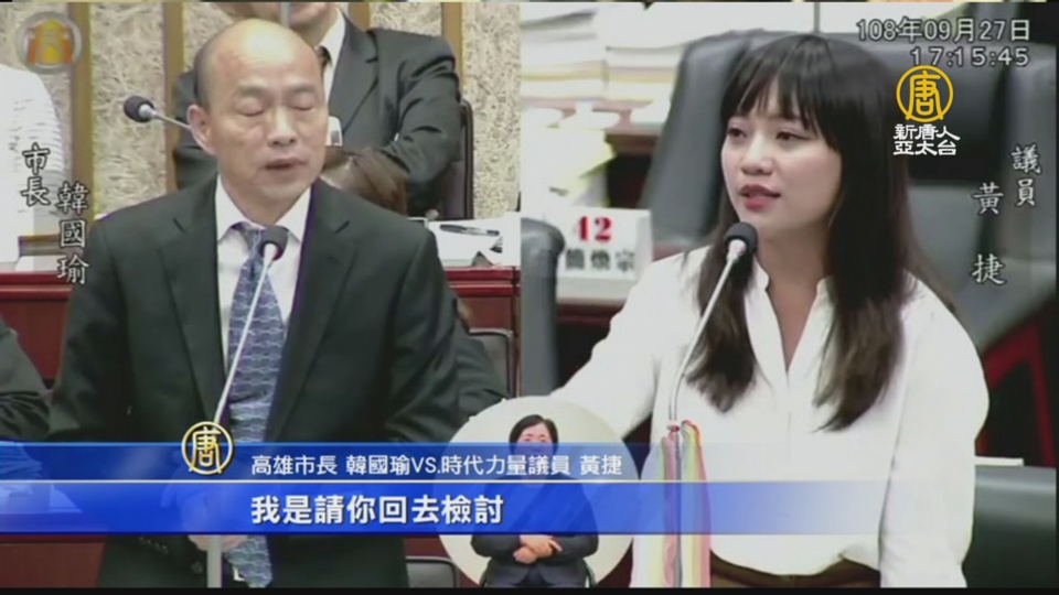 【新唐人亞太台 2019 年 09 月 27 日訊】高雄市議會今天進行施政質詢,時代力量議員黃捷提出多項高雄市府政策缺失,還把競選、市政混在一起。不過市長韓國瑜答覆時,反批黃捷「偏差心態嚴重」一一做出反駁,黃捷多次提醒,韓國瑜只要說明如何振興鳳山觀光,韓國瑜仍堅持要念完手中的稿子,也讓黃捷不滿,韓國瑜是在浪費議員質詢的時間。
