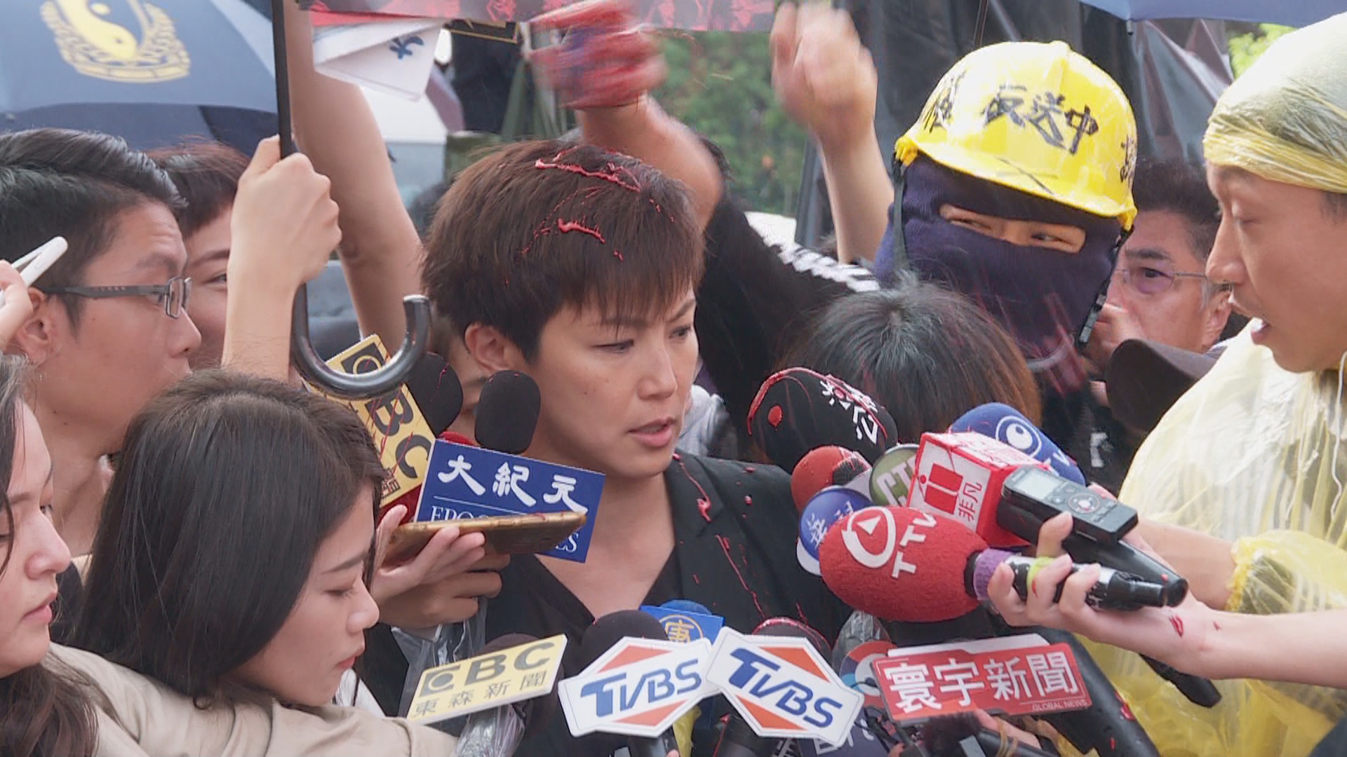 何韻詩接受台灣媒體訪問,一旁卻有一名帶著安全帽、蒙面偽裝成參與遊行的男子,向何韻詩潑紅漆,引起現場一陣混亂。