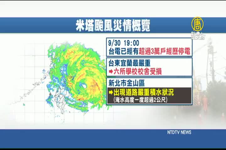 【新唐人亞太台 2019 年 09 月 30 日訊】帶您關心,中颱米塔襲台,在各地造成輕重不一的災情。根據台電統計,截至傍晚七點,已經有超過3萬戶經歷停電,以台東宜蘭停電狀況最嚴重,並有六所學校出現校舍受損的零星災情。另外,在新北市金山區有出現道路嚴重積水狀況,淹水高度一度超過2公尺。水保局則針對各地區風雨狀況,發佈土石流警戒預報。