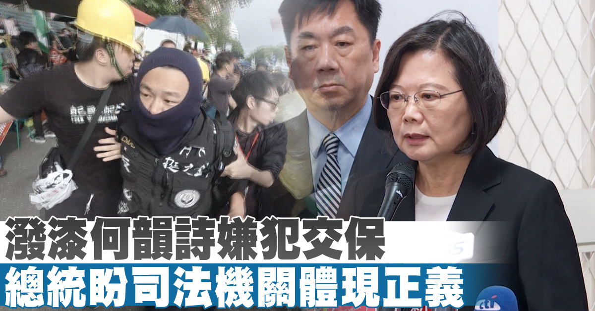 【新唐人亞太台 2019 年 10 月 01 日訊】統促黨分子涉嫌潑漆香港藝人何韻詩,被法官裁定交保,引起議論。總統蔡英文今天受訪時也說,民眾對這個事件高度關注,她不便評論司法個案,但她認為司法機關應該體現社會正義保障國家利益。