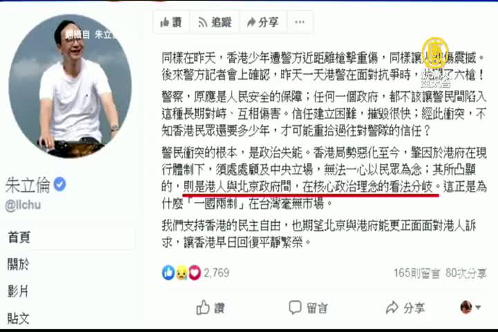 【新唐人亞太台 2019 年 10 月 02 日訊】昨天香港少年遭警方近距離槍擊重傷,引發各界嘩然,前新北市長朱立倫也在臉書寫下,「警民衝突的根本,是政治失能。香港局勢惡化至今,…其所凸顯的,則是港人與北京政府間,在核心政治理念的看法分岐。這正是為什麼「一國兩制」在台灣毫無市場。」並在文末期望北京與港府能更正面面對港人訴求,讓香港早日回復平靜繁榮。