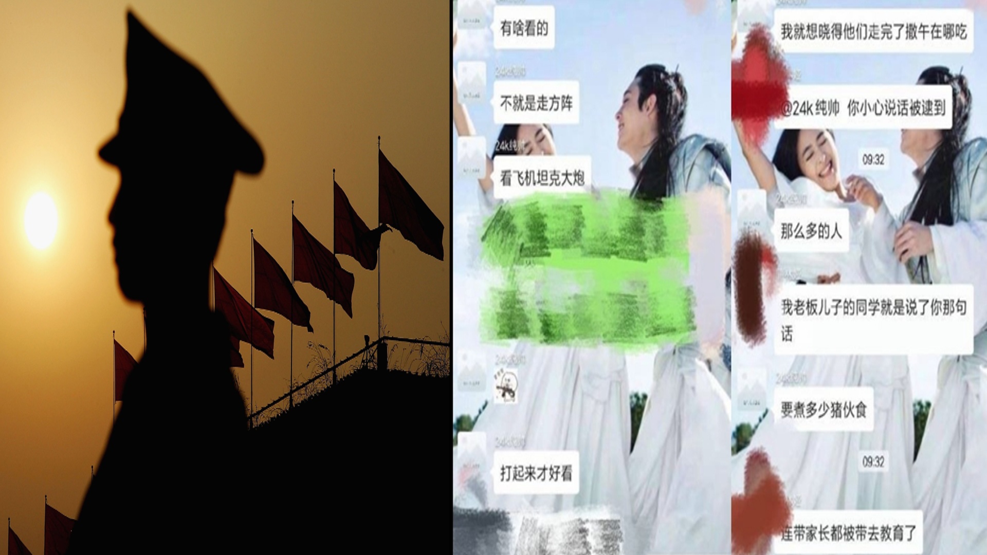 【新唐人亞太台 2019 年 10 月 03 日訊】中共在「十一」舉行大規模閱兵。四川南充一名網民因在微信群裡說,閱兵「沒啥好看的」,比較想知道他們中午吃甚麼,要煮多少豬伙食,而被行政拘留7天,這名網友在閱兵當天的清晨,就遭到抓捕。自由亞洲電台報導,近期因談論香港、閱兵問題,而被拘留、被約談的人,全中國大陸起碼有上萬人。