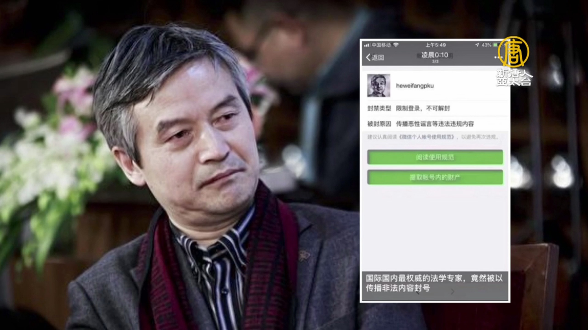 【新唐人亞太台 2019 年 10 月 08 日訊】北大自由派法學教授賀衛方的弟弟賀維彤,最近傳出因為轉發一則視頻,被警方以「非法持有恐怖主義、極端主義物品」的罪名刑拘。十一前夕,賀衛方個人的微信帳號也遭到永久封號後。