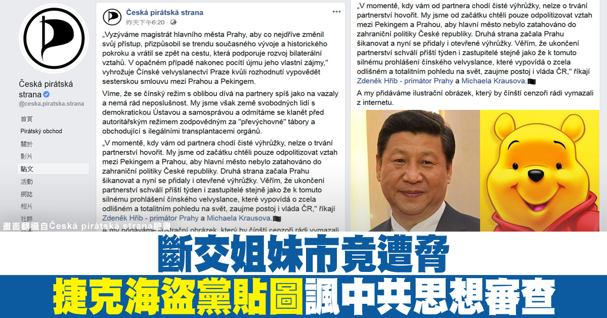 捷克首都布拉格,7日與不願刪除「一中條款」的北京斷絕姐妹市關係,中共駐捷克大使館便批判甚至公開威脅。9日晚間,布拉格友台市長賀瑞普所屬的捷克海盜黨在臉書發文,指出他們不會屈服於中共,還在文章中貼出習近平和維尼的對比照,嘲諷意味十足。